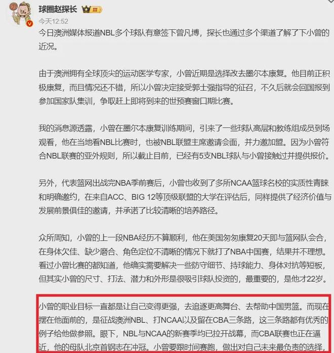 如果曾凡博仍有挑戰NBA的想法,那么NCAA是一個(gè)好出路,曝光度遠比NBL和CBA高;若是想歷練,NBL乃絕佳選擇,周琦就曾在澳洲打過(guò)球并得到極大的提升。