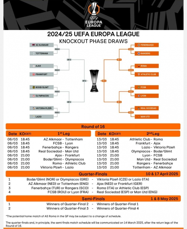 2月22日訊 歐足聯(lián)官方公布了歐聯(lián)杯1/8決賽的開(kāi)球時(shí)間,首回合皇家社會(huì )vs曼聯(lián)3月7日1點(diǎn)45分開(kāi)球,羅馬vs畢爾巴鄂3月7日4點(diǎn)開(kāi)球。