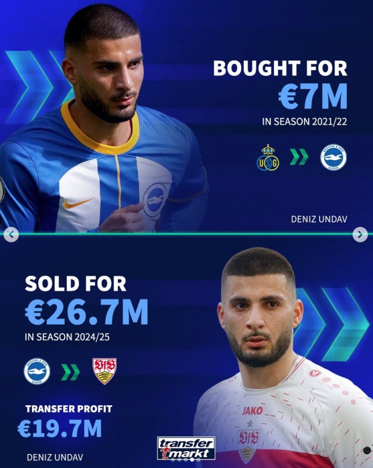 德轉列布萊頓近年5筆低買(mǎi)高賣(mài),凈賺超2億歐:凱塞多&庫庫在列
