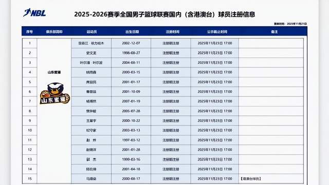 山東蜜獾男籃是在11月22日上午公布的15人注冊名單,這15人分別是:亞森江-依力哈木、史文龍、葉爾潘-葉爾波、姚雨鑫、席益民、曹晉昌、楊博然、焦鐘毅、王星宇、紀守家、趙燁、趙錦洋、郭杰、陳玖璋和馬港燊。