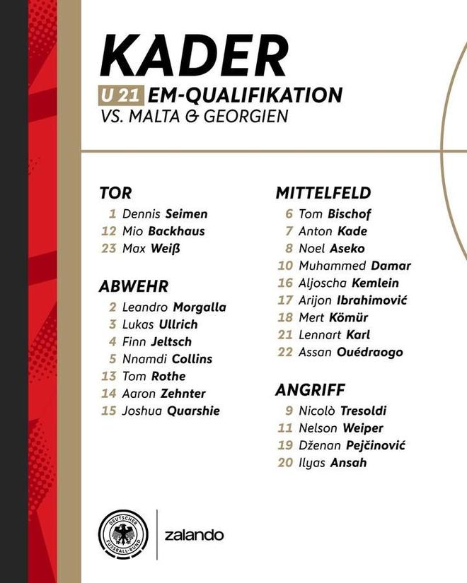 德國U21大名單:17歲卡爾入選,比朔夫、阿爾揚-伊布在列