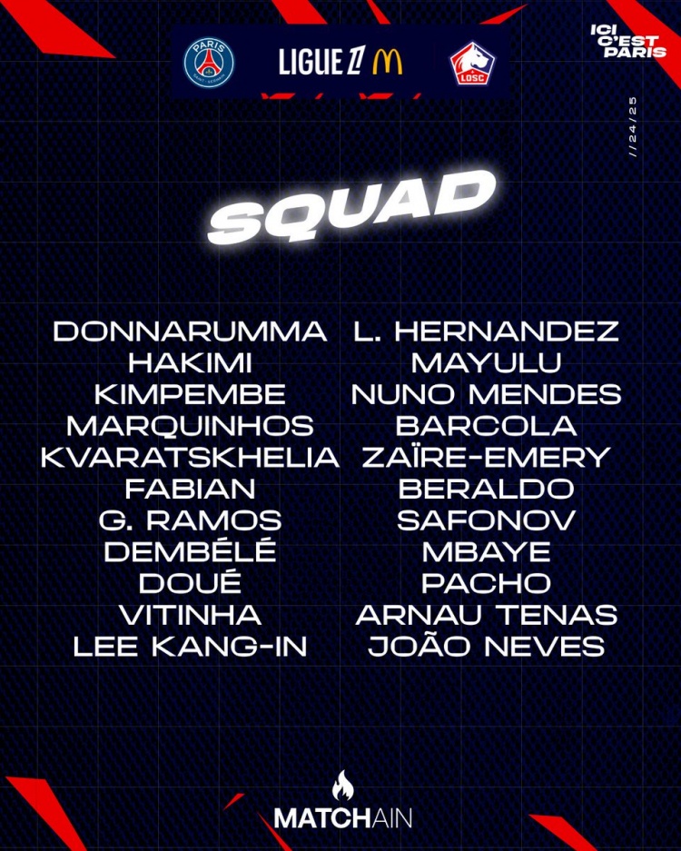 3月1日訊 北京時(shí)間明天4:05,法甲第24輪巴黎主場(chǎng)對陣里爾,巴黎公布此役球隊大名單,克瓦拉茨赫利亞、登貝萊等球員在列。