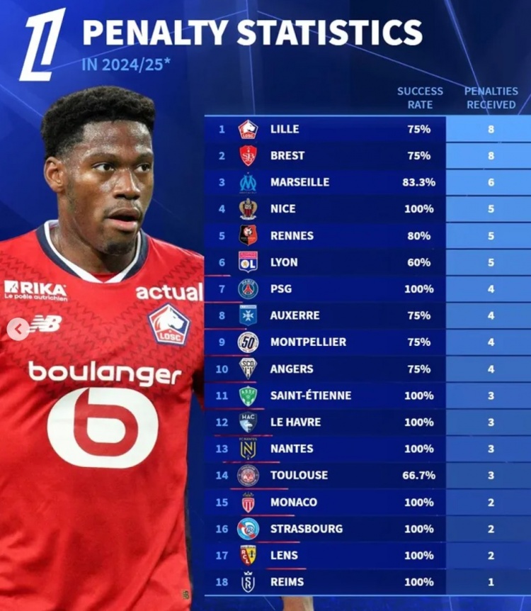 法甲:里爾和布雷斯特8次并列最多,馬賽6次,尼斯、雷恩和里昂為5次,巴黎等4隊均4次。